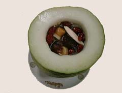コース料理 要予約 冬瓜をくりぬき鶏ガラスープを入れ90分ほど蒸しす。改めて金華ハム、干し貝柱、棗(なつめ)、クコ、ワイサン(薬膳)、椎茸と鶏ガラ上湯で丁寧に5時間煮込んだスープを注ぎいれ、内壁を削りながら賞味する。