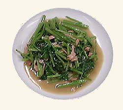 空心菜(クウシンサイ)、雍菜(オンチョイ)とも呼ぶ青々として茎がストロー状の広東の代表的ヤサイで、かっては生産農家の栽培技術未熟により本場に比べ固いものしか出荷できなかったが、今日では軟らかく美味しい空心菜が出回るようになった。 腐乳(大豆を発酵させたチーズのような調味料)を使って味付けした腐乳炒雍菜(フウイーチャオオンチョイ)は広東省人の大好きな風味名菜(オラが田舎の自慢の一品)です。ゆえにお客さまから「腐乳を使わず塩味で炒めて」とオーダーされるとたいへんがっかりさせられます。